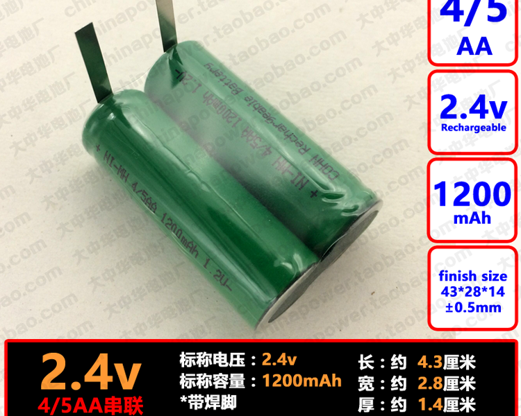 正向串联 带焊脚可充电 4/5AA 1200mAh 2.4v NIMH 短五号COHN电池