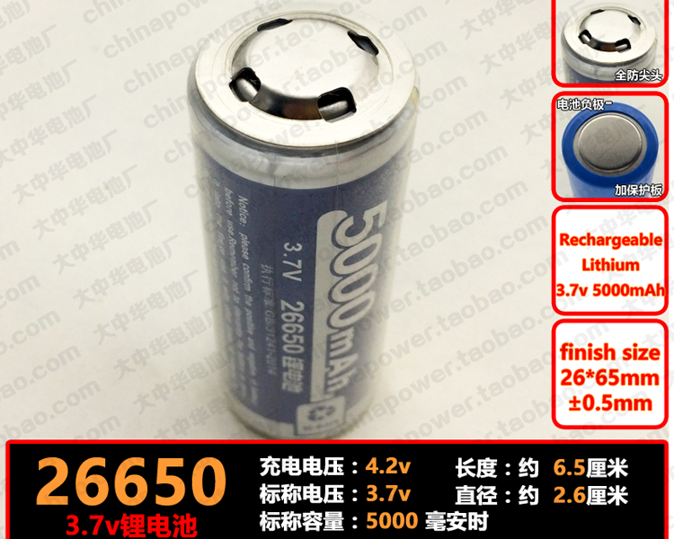 可充电强光手电筒 3.7v 26650锂电池 5000mAh 大容量4.2v全新A品