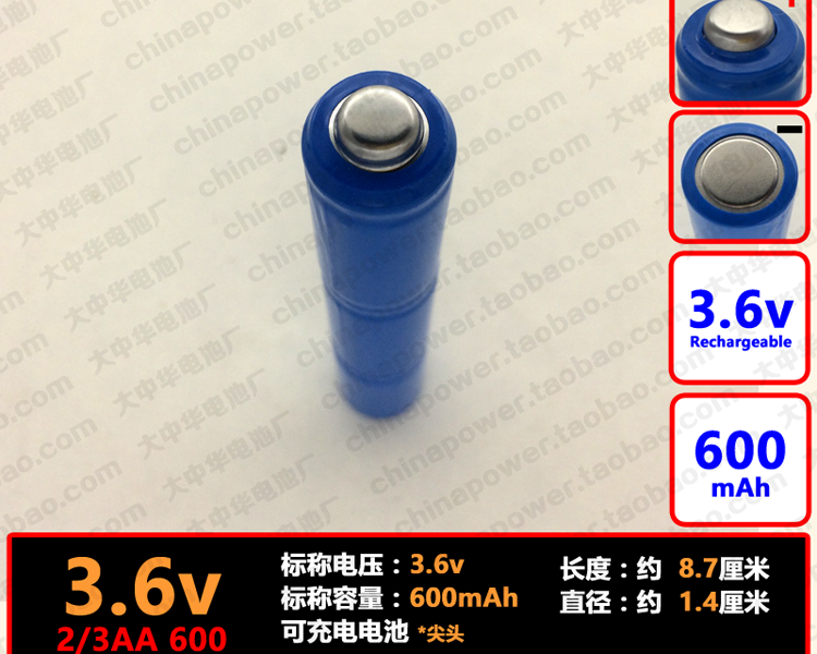 强光手电筒 尖头 可充电电池组 2/3AA 3.6V 600mAh