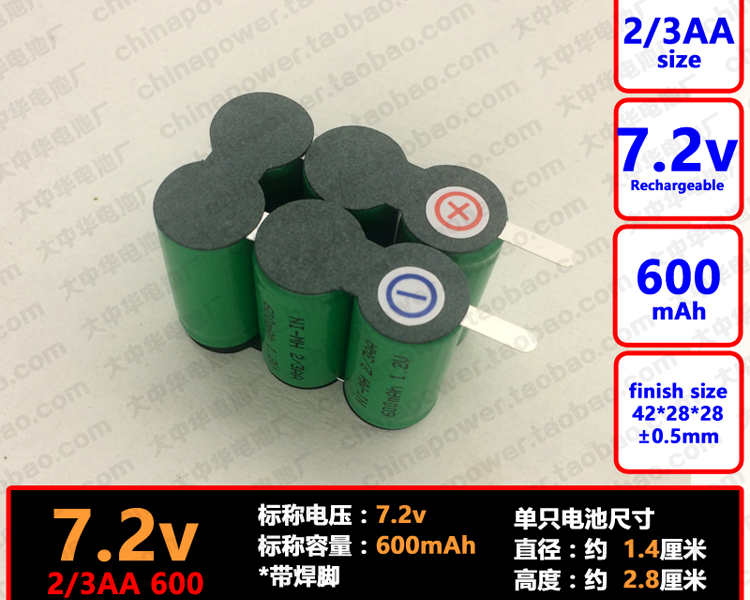 带焊脚可充电COHN2/3AA7.2V600mAh镍氢NIMH电池组