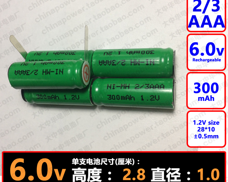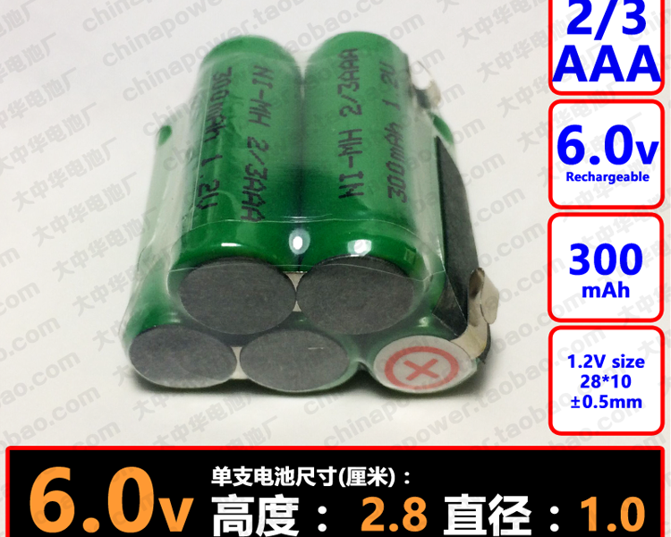 可充电6.0v 2/3AAA H型COHN短7号镍氢电池组 防狼强光手电筒专用