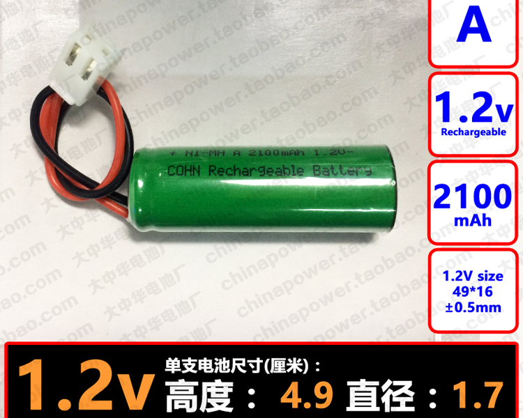 带插头NIMH A 2100mAh 1.2v 尺寸17x49mm动力型COHN可充电电池