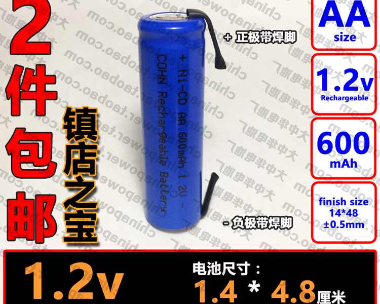 1件1支带焊脚 Ni-CD AA 1.2V 600mAh COHN飞科剃须刀用可充电电池