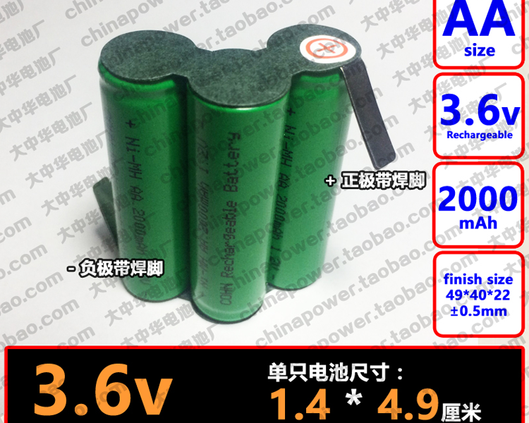 带焊脚可充电C型 3.6V AA 2000mAh COHN吸尘器动力电池组
