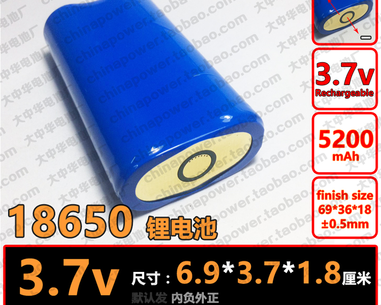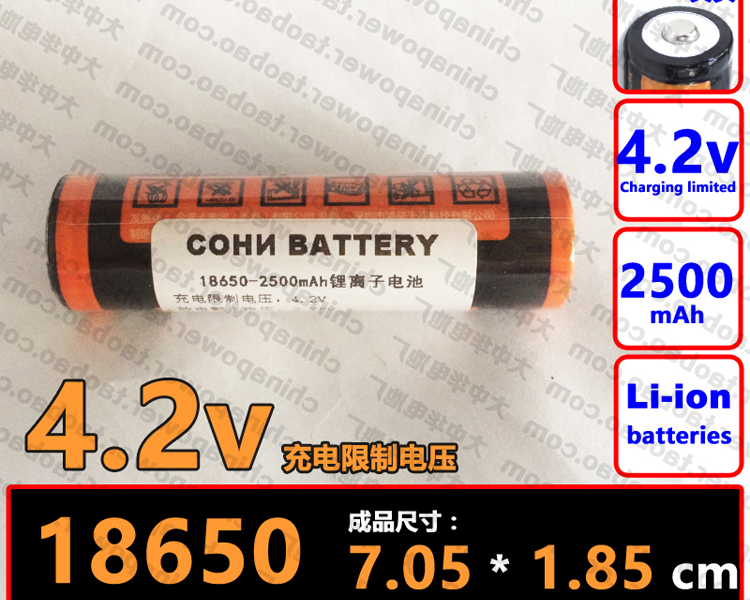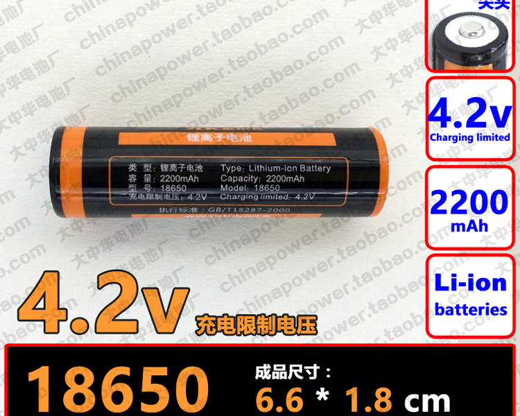 尺寸1.8x6.6厘米 充电限制电压4.2v 18650 2200mAh 锂离子电池