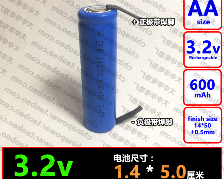 1件1支 带焊脚 可充电 3.2v IFR14500 600mAh COHN 5号锂电池