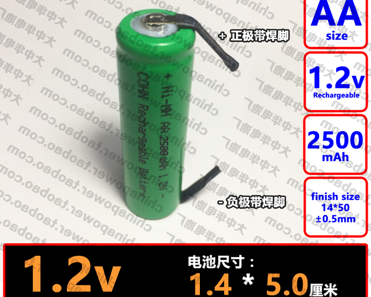 带焊脚 COHN 5号可充电电池 AA 2500mAh 1.2v 尺寸14x50mm