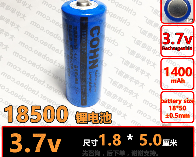 COHN ICR18500 Li-ion 3.7v 1400mAh Rechargeable Battery锂电池