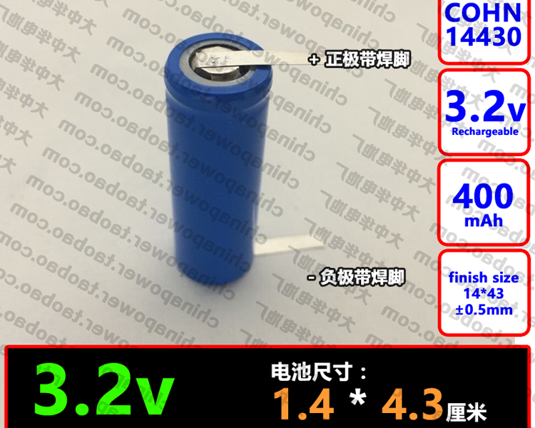 3.2v 14430 400mAh带焊脚 可充电COHN锂电池 直径1.4 长度4.3厘米
