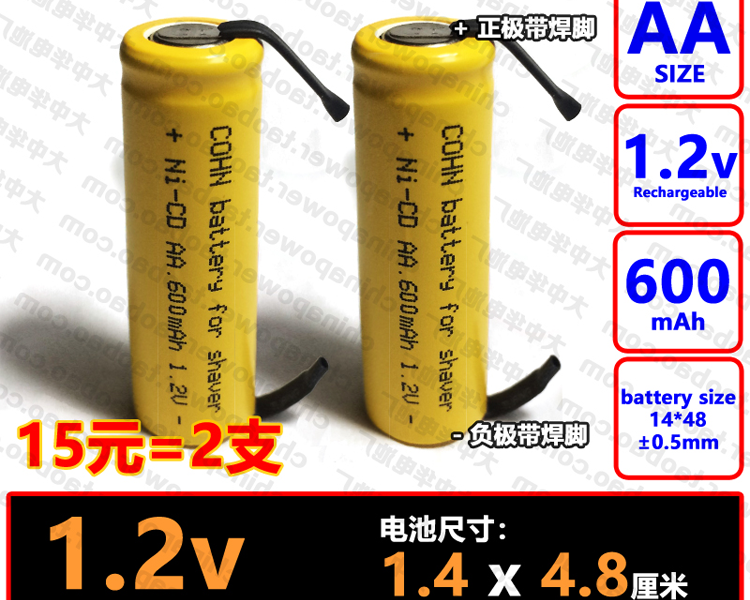 1件2支 黄皮带焊脚 Ni-CD AA 1.2V 600mAh COHN可充电5号平头电池