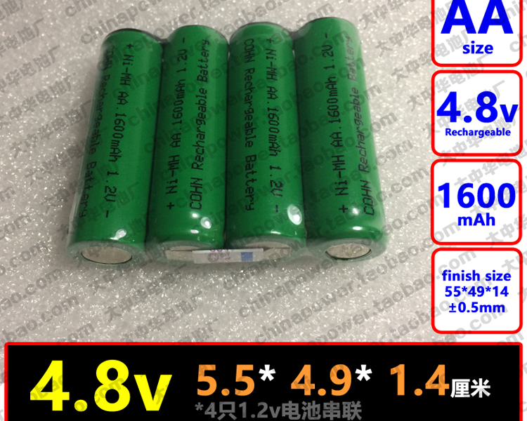 平头 4.8v NIMH AA 1600mAh COHN可充电5号电池组