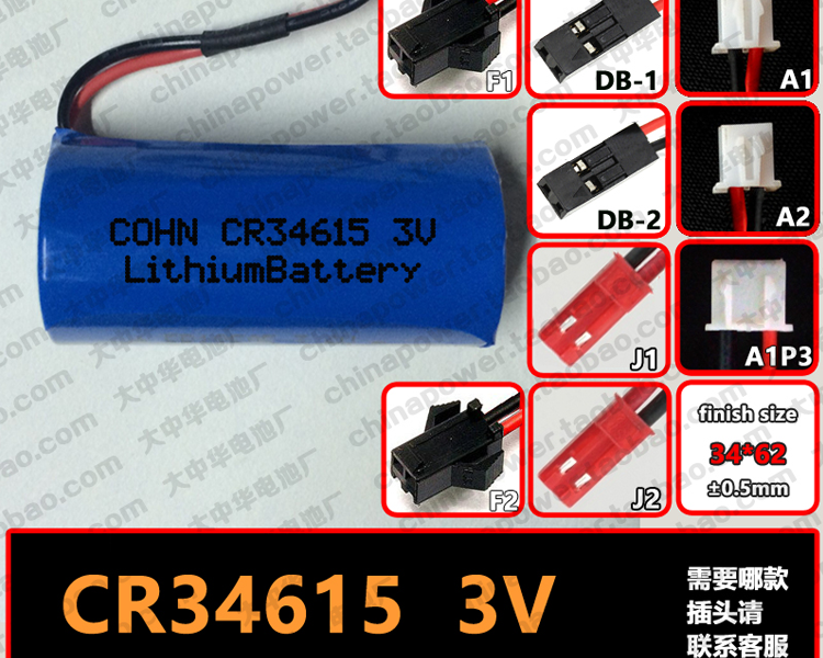 CR34615 3v锂电池 COHN Lithium Battery 尺寸34x62mm 工业装