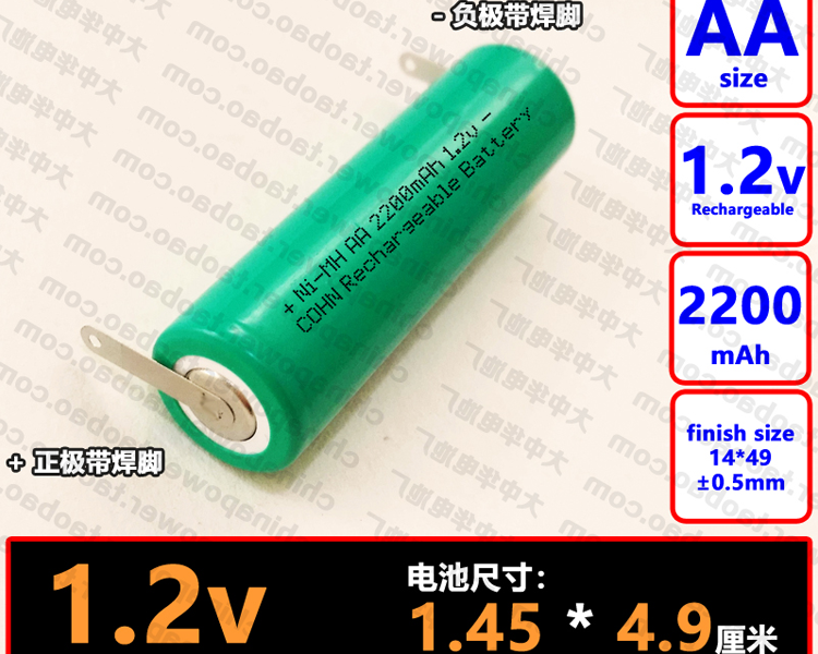 1件1支 带焊脚 NIMH AA 1.2v 2200mAh 5号平头 COHN可充电电池