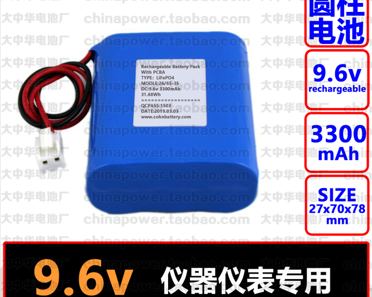 COHN可充电磷酸铁锂电池组 LiFePO4 IFR26650 3300mAh 9.6v