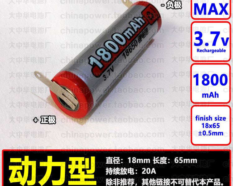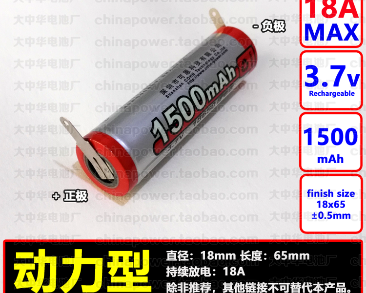 带焊脚COHN18650 1800mAh 3.7v 10C可充电3.6v手电钻动力型锂电池