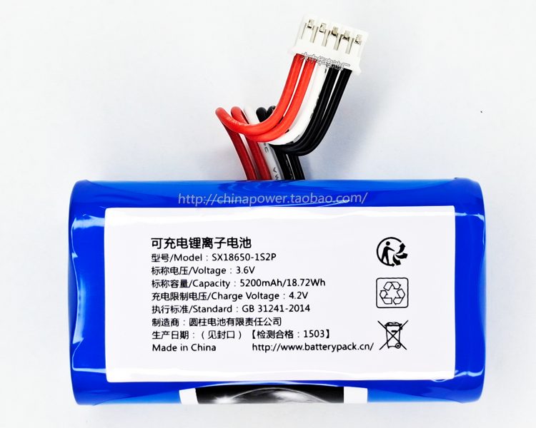 5线插头 可充电锂离子电池 SX18650-1S2P 3.6v 5200mAh / 18.72Wh
